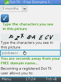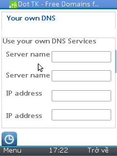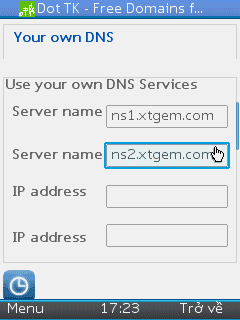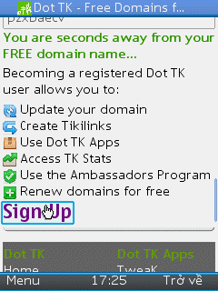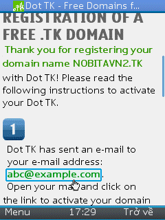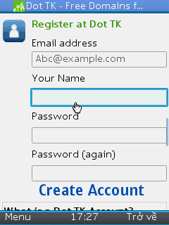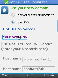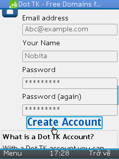 BƯỚC 1: Dùng trình duyệt vào trang http://dot.tk để đăng kí tên miền. Hình dưới BƯỚC 2: Bấm vào ô phía dưới trang để chèn tên trang muốn đăng kí. Ở đây mình đăng kí là: NOBITAVN2 Sau đó bấm vào nút [GO] BƯỚC 3: Nếu tên đó chưa có người sử dụng thì nó sẽ hiện lên như hình dưới. Sau đó bạn bấm vào Use DNS (sử dụng DNS) Sau đó bạn bấm tiếp vào Your own DNS (DNS riêng của bạn) Sau đó trang sẽ hiện ra như hình dưới BƯỚC 4: Tiếp tục điền vào 2 ô Server name (Tên máy chủ) Ô thứ nhất bạn điền là ns1.xtgem.com Ô thứ 2 bạn điền là ns2.xtgem.com như trong hình. 2 ô IP để trống nhá! BƯỚC 5: Điền chữ hiện trên ảnh vào ô phía dưới BƯỚC 6: Bấm vào Sign up . Trang sẽ hiện lên như hình Tiếp tục bấm vào Email address (Địa chỉ email) BƯỚC 7: Trang tiếp theo sẽ hiện ra, bạn điền địa chỉ email của mình vào (dùng để kích hoạt tên miền) và bấm vào nút [NEXT] (Tiếp) BƯỚC 8: Điền thông tin vào các ô Your name [Tên của bạn], Password [Mật khẩu], Password (again) [Mật khẩu (lặp lại)]. Sau đó bấm vào CREATE ACCOUNT Nếu thành công trang sẽ hiện lên giống hình Sau đó bạn vào email của mình (vừa ghi ở trên đó) để kích hoạt tên miền Sau khi kích hoạt xong thì bạn đăng nhập vào wap của mình. Chọn Thiết lập => Đậu tên miền Điền vào ô tên miền vừa đăng kí thôi!!! Ở đây mình đăng kí là NOBITAVN2.TK nên mình sẽ điền vào là NOBITAVN2.TK CHÚC CÁC BẠN THÀNH CÔNG!